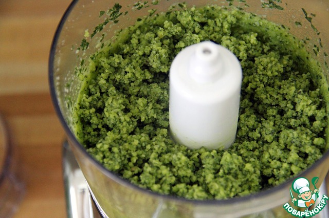 Добавить базилик и 3 ст. л. оливкового масла и все измельчить до однородной массы.