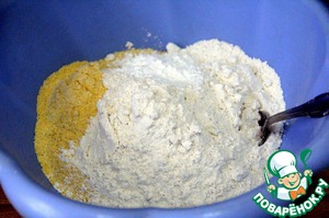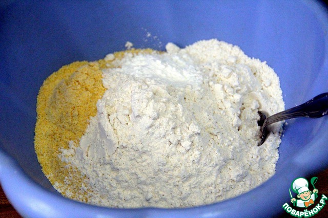 В миске смешиваем оба вида муки, добавляем разрыхлитель и все перемешиваем.
