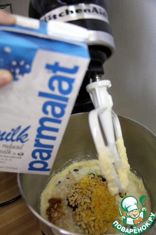 Изюм просушиваем бумажным полотенцем и добавляем его к масляной смеси. Туда же добавляем кедровые орехи, молоко, мелко-натертую цедру лимона, экстракт ванили и тщательно все вымешиваем.