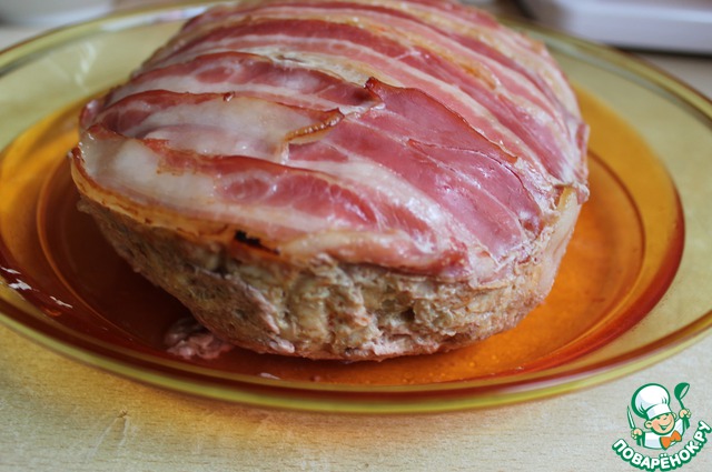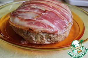 Берем форму, для хлеба которой вы пользуетесь. Выстилаем обязательно бумагой. Затем кладем на низ половина бекона, выстилаем им дно. И выкладываем наш фарш. И осталной бекон выкладываем сверху.
