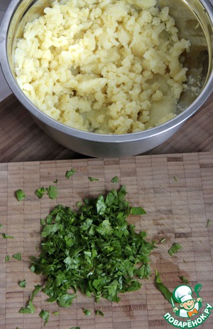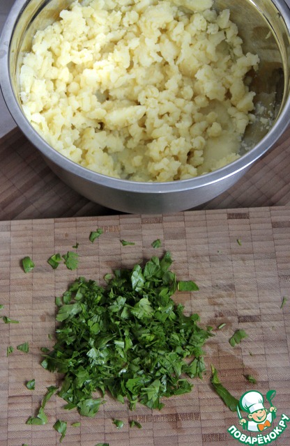 Петрушку помыть, просушить бумажными полотенцами. Листики мелко нарубить. Добавить в картофель, приправить солью и перцем. -