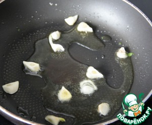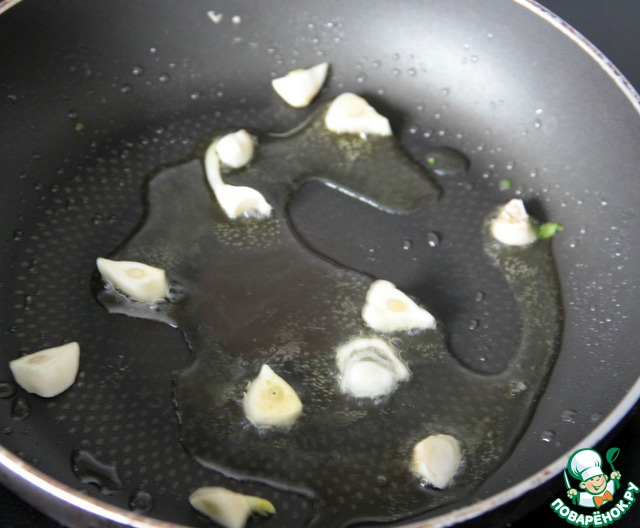 Разогреть в сковороде (24 см) 2 ст. л. оливкового масла и поджарить чеснок до золотистости, ароматизируя тем самым масло. Румяный чеснок вынуть из масла.