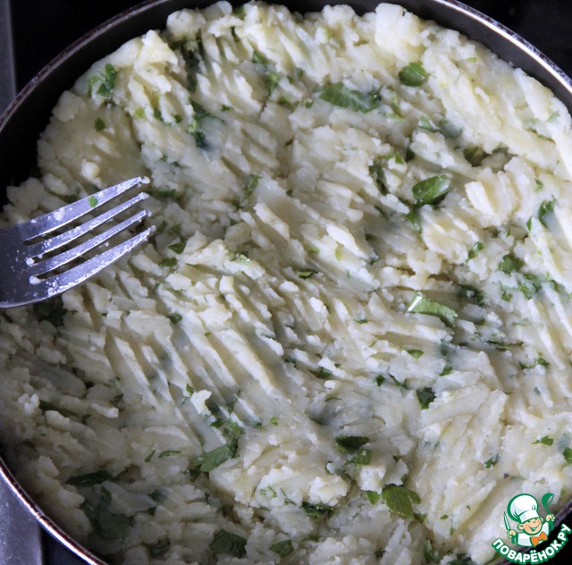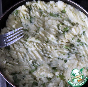 Распределить по сковороде картофельную массу и выровнять, придавливая с помощью вилки, чтобы получилась форма мини-пирога.