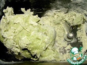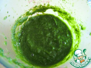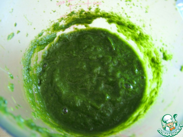 Я брала замороженный шпинат. Приготовила его в микроволновке в течение 3 минут и сделала пюре блендером. Нужно 100 грамм пюре. Остудила до комнатной температуры.