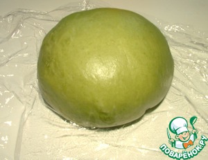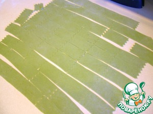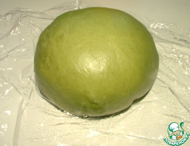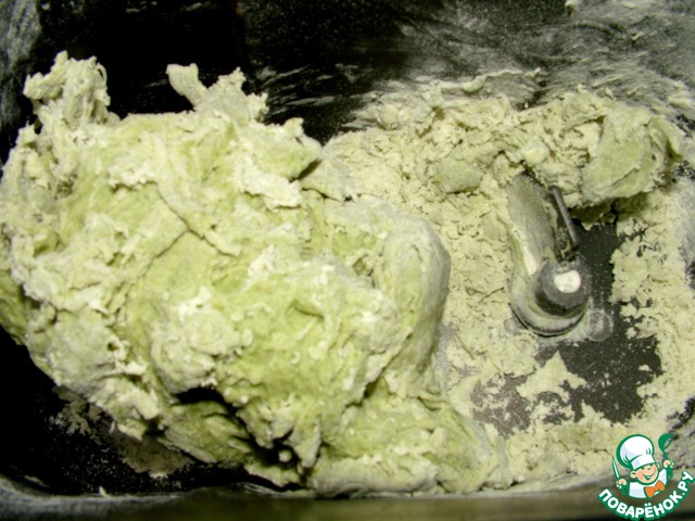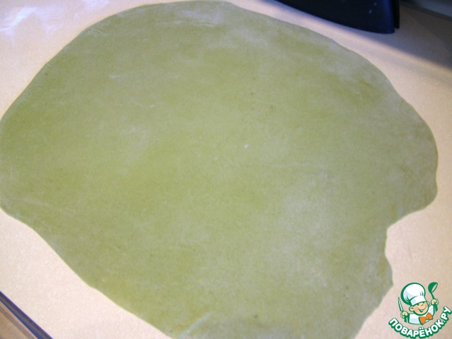 Из пюре шпината, яиц, муки, ложки оливкового масла и щепотки соли сделала тесто. Я привлекаю для тежелой работы свою хлебопечку. 2 раза в режиме "тесто" - в общей сложности 40 минут, и оно становится очень элластичным. Тесто должно быть крутое, может быть придётся добавить муки!