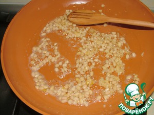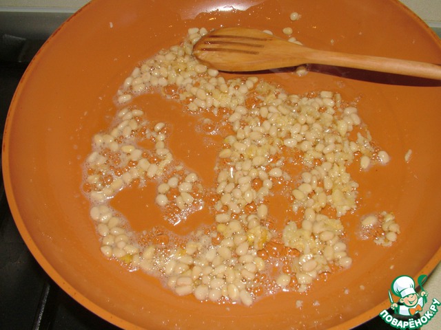 Сливочное масло растапливаем в большой сковороде, выдавливаем в него чеснок и добавляем орешки. Поджариваем все вместе до золотистого цвета орешков на среднем огне.