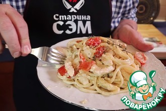 Снимаем с огня, выкладываем в сковороду отваренную пасту и быстро перемешиваем. раскладываем по тарелкам, приправляем перцем, посыпаем тертым пармезаном и зеленью. Я люблю с тимьяном. Подаем в горячем виде.