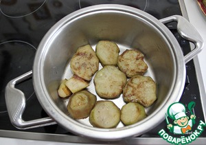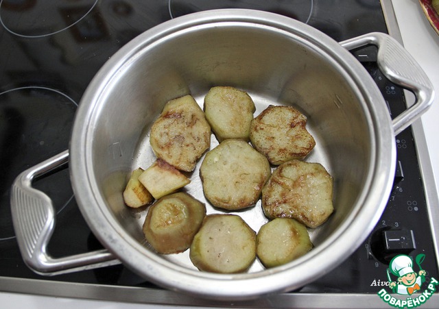 Очищаю от кожи, нарезаю толстыми кружками. Чуть-чуть присаливаю и оставляю на некоторое время, чтобы баклажаны отдали горечь. Немного обжариваю баклажаны.
