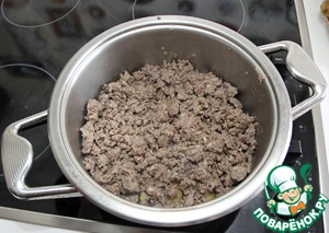 Фарш немного обжариваю на оливковом масле, при обжарке обильно перчу смесью перцев, соответственно, солю. Специй нужно столько, чтобы потом фарш отдал это овощам, поскольку при дальнейшем приготовлении добавляю только немного перца горошком.