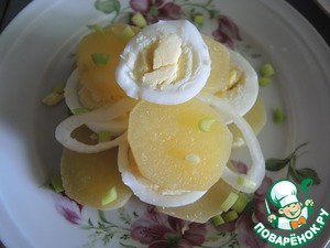 Отвариваем картофель, яйца. Нарезаем их кружочками. Лук нарезаем кольцами.