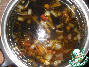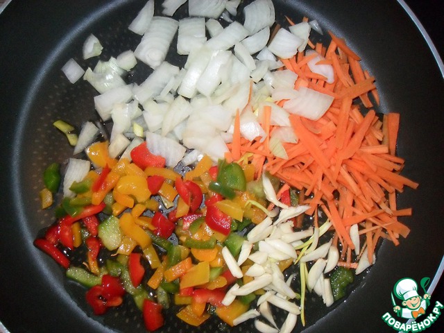 Пока чечевица отваривается, лук, морковь, чеснок, болгарский перец обжариваем.