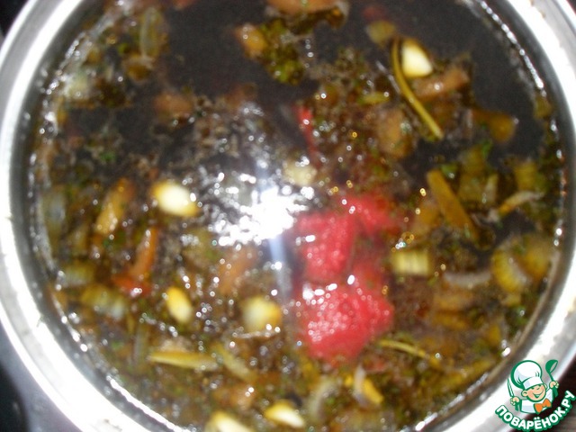 Затем очередь за томатной пастой. Хорошо перемешиваем.