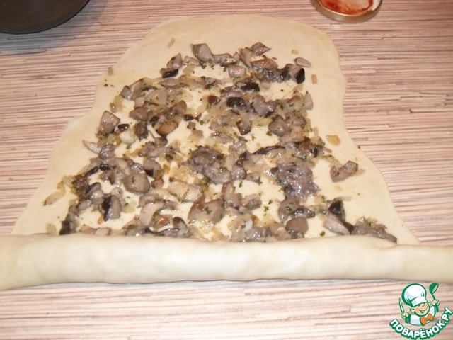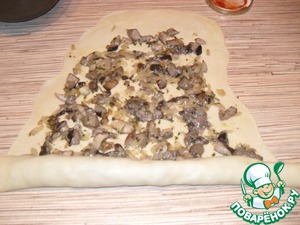 Замесить тесто мука+соль+растительное масло+вода. Раскатать тонко и выложить на него равномерно грибы. Теперь заворачиваем рулет.