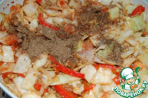 Далее капусту, соль, специи.