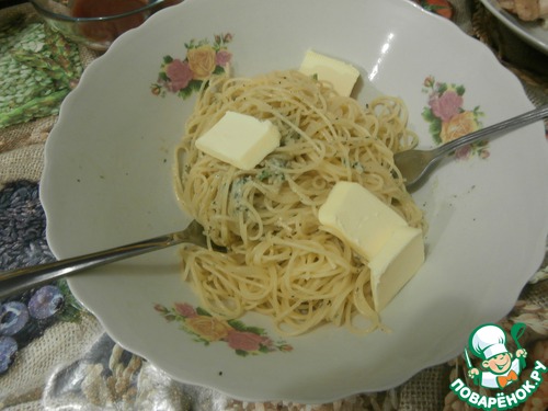 Заранее, в глубокую тарелку кладу зелёный соус. Макароны остывают мгновенно!!! А я люблю их очень горячими, поэтому надо с максимальной быстротой смешать их с готовым соусом и подавать. Если капеллини покажутся сухими, будут тяжело смешиваться, превратятся в один противный неразъёмный клубок, сразу же, немедленно, добавляйте несколько небольших кусочков сливочного масла и быстро перемешайте. Они сразу станут скользкими, приятными, нежными и сливочно-ароматными, и будут хорошо наматываться на вилку.