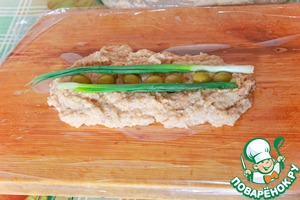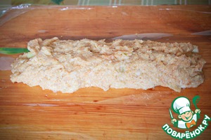 На прямоугольный кусок пищевой пленки выкладываем 1/2 фарша,