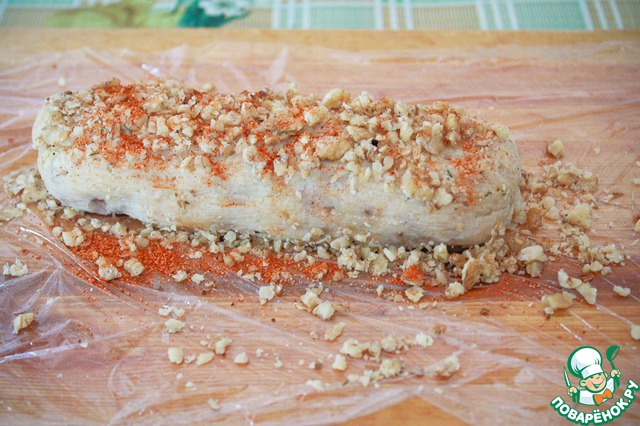 А те колбаски у которых внутри грецкий орех, обваляйте в измельченных грецких орехах и специях.