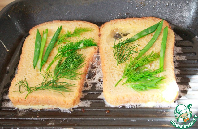 Когда пришла пора подавать колбаски к столу, я решила приготовить гренки с яйцом на гриле, когда хлеб уже был на сковороде мне пришло в голову добавить зелени, чего я и сделала и украсила хлебушек зеленью.