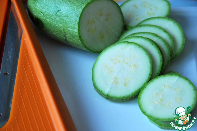 Молодой цуккини нарезаем тонкими кольцами, лучше использовать специальную тёрку.