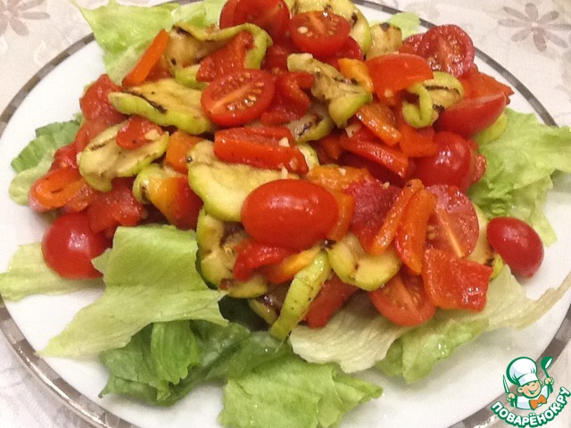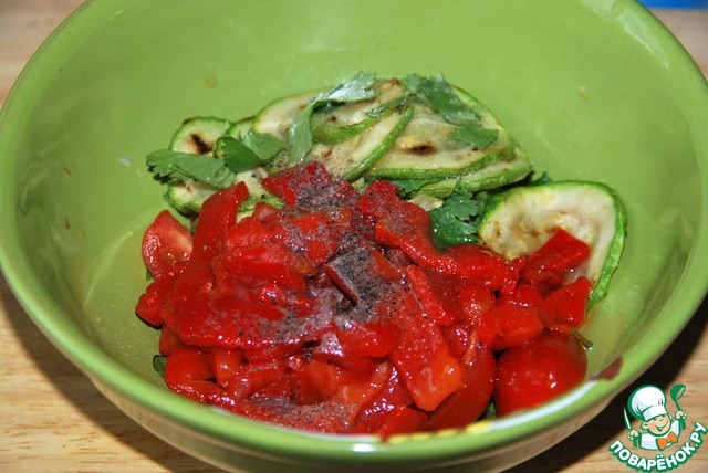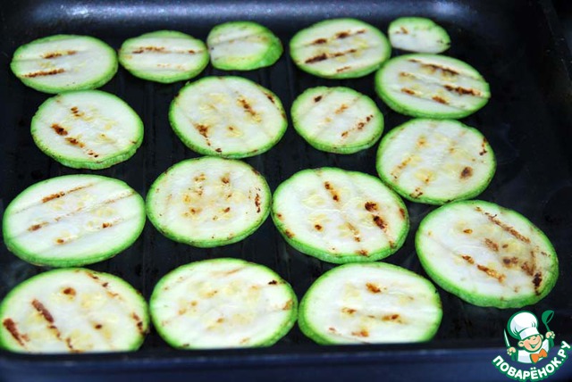 Цуккини обжариваем с двух сторон без масла, лучше использовать сковороду-гриль.