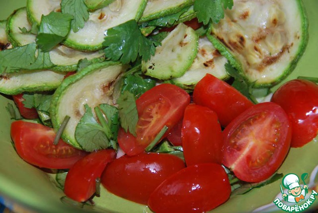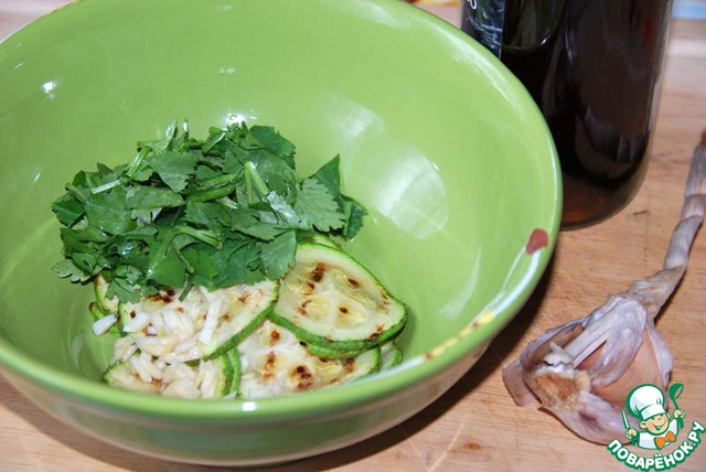 К ещё горячим обжаренным цуккини добавляем мелкопорубленный чеснок, мелкопорезанную кинзу, бальзамический уксус, перемешиваем и отставляем мариноваться на 10-15 минут.