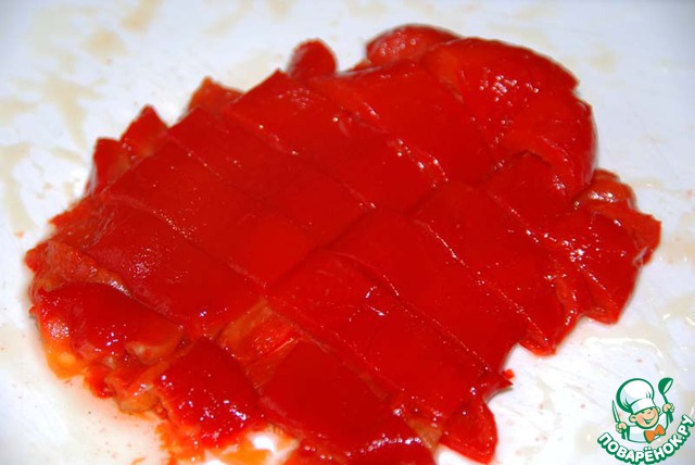 Запечённый перец очищаем от плёнки и семян и режем на тонкие полоски.