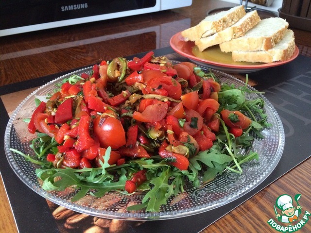 Сверху рукколы кладём перемешанный салат.