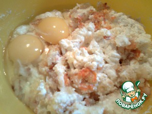• В массу введите 2 яйца, соль и всё тщательно перемешайте
