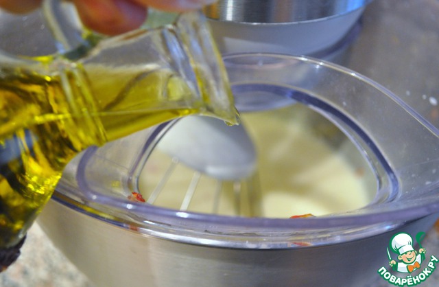 Влить молоко с шафраном, тонкой струйкой, не останавливая миксер. Добавить цедру апельсина, оливковое масло и апельсиновый сок.