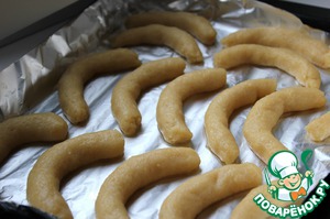 • С помощью шприца или пакета, как у меня, выдавить печенье на противень в форме полумесяца и выпекать до готовности при 200 градусых 16 минут. У меня духовка маленькая поэтому в моем случае получилось совсем не так (было 65 градусов и время гораздо дольше).