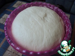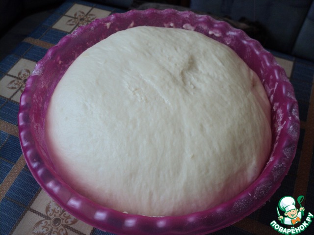 Дрожжи разводим тёплой водой, добавляем 1 ч. л. сахара и даём подняться. К ним добавляем оставшиеся ингредиенты и замешиваем тесто. Далее, на столе руками его вымешиваем, добавляя постепенно растительное масло. Тесто оставляем в покое на 1,5-2 часа, обминая его.