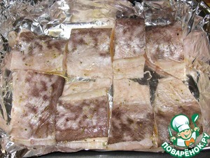 Рыбу почистить от чешуи, вынуть внутренности, хорошенько вымыть, порезать на порционные кусочки. По желанию можно вырезать хребет, я делала и с ним и без него, одинаково вкусно. Выложить на лист фольги, посолить и посыпать сухим сельдереем и специями.