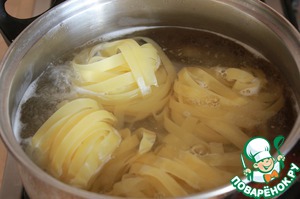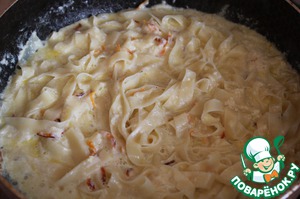 В большой, емкой сковороде соединяем тальятелле и наш соус. Оставляем на огне, помешивая, пока соус не загустеет