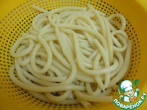 Отварить в подсоленой воде пасту согласно инструкции на упаковке. Откинуть на дуршлаг.