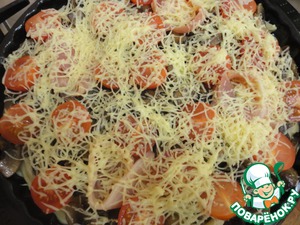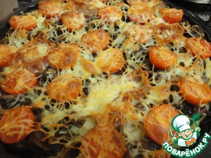 Помидорки помыть, обсушить и разрезать пополам. Распределить по верх грибов. Сыр натереть на мелкой тёрке. Посыпать половиной сыра.