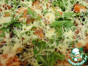 Рукколу помыть, обсушить, порвать руками на крупные части. Посыпать запечённую пасту оставшимся сыром и рукколой.
