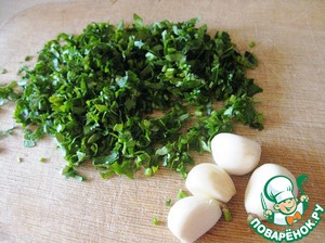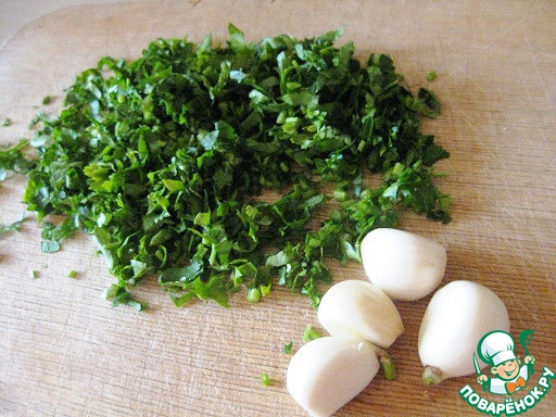 Петрушку обмыть, обсушить и мелко порубить. Очистить чеснок.