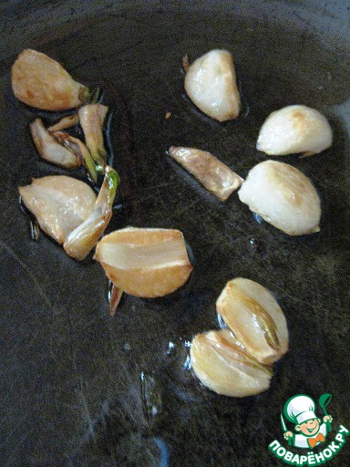 В сковороде разогреть оливковое масло, спассеровать в нем до золотистого цвета чеснок, разрезанный пополам. Вытащить чеснок из масла.