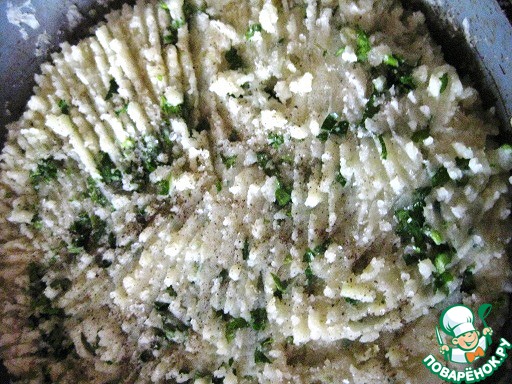 В горячее масло добавить картошку и петрушку, используя вилку размять до однородности. Посолить и поперчить на этом этапе.