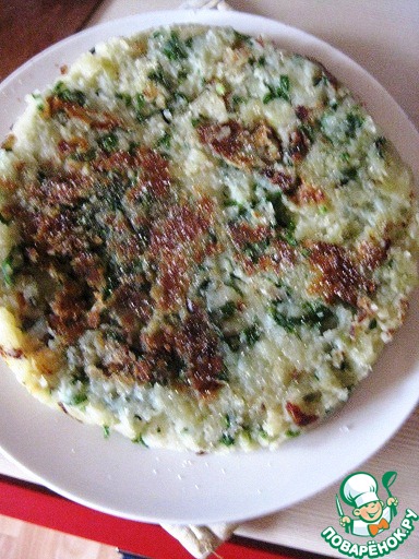 Выровнять поверхность, чтобы было похоже на пирог. Добавить огонь и жарить 10 минут с одной стороны до золотистого цвета.