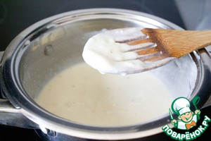 Добавляя молоко, интенсивно размешивать, предотвращая образование комочков. Уварить соус до загустения, добавить щепотку мускатного ореха и молотого черного перца, перемешать.