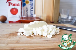 Избавить от жидкости моцареллу и нарезать на мелкие кубики.
