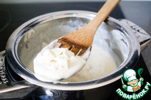 В немного остывший соус бешамель ввести кубики моцареллы и перемешать.