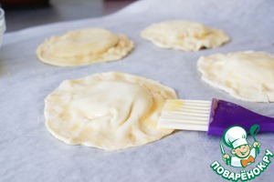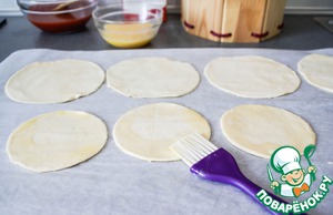 Кружки теста меньшего диаметра смазать взбитым яйцом по краям.