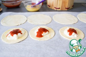 В середину выложить около ст. ложки бешамеля с моцареллой и чайную ложку томатной пассаты, оставляя края теста свободными ( около 1 см).