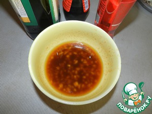 • Готовим заправку. Чеснок очистить измельчить добавить масло, соевый соус, уксус, перец и сахар. Снять пробу и добавить тот ингредиент которого Вам не хватает.