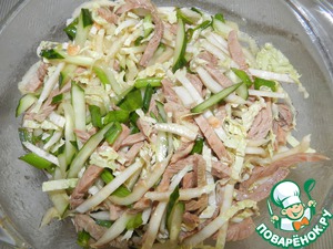 • Теперь смешиваем мясо, огурцы и зелень, заливаем заправкой и отправляем в холодильник на 1-2 часа.