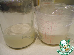 С вечера делаем две опары. Для опары на закваске смешиваем 70 г. закваски, 100 г. воды и 120-130 г. муки. Консистенция как на оладьи.