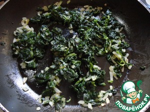Добавляем шпинат, перемешиваем, даем потомиться вместе с луком. У меня шпинат был замороженный. Оговорюсь, что в источнике свежий шпинат следует немного отварить в небольшом количестве воды и отжать. Я, даже когда использовала свежий шпинат, просто нарезала его и томила под крышкой вместе с луком, не отваривая.