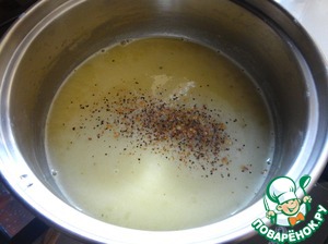 Последним постепенно вливаем горячий бульон, постоянно помешивая. Добавляем приправы. Количество бульона можно регулировать, делая соус гуще по вашему вкусу. Соус также можно сделать заранее, разогрев его перед подачей и добавив немного бульона, если он стал более густой.